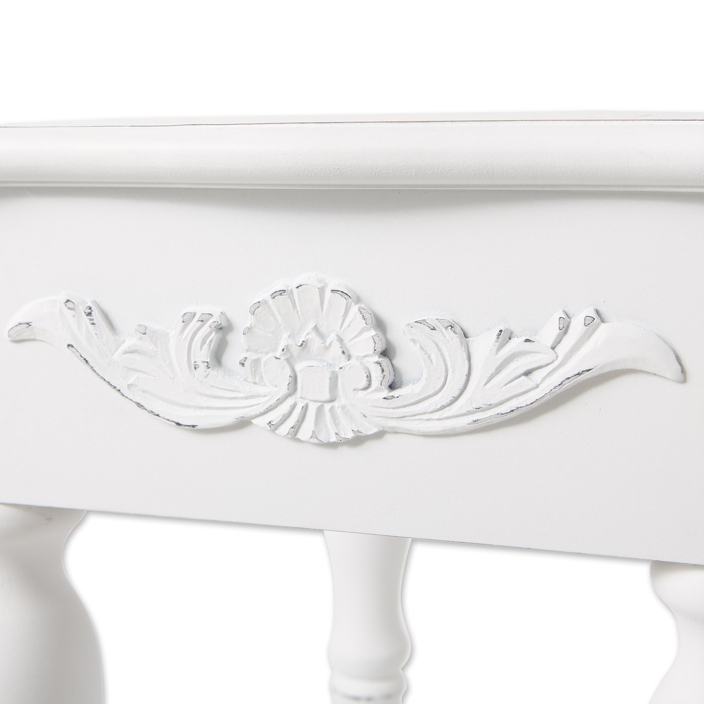 • Shaped legs and shell-design trim add distinction to this decorative side table perfect for any space in your home. A generous drawer and a bottom shelf also provide plentiful storage.